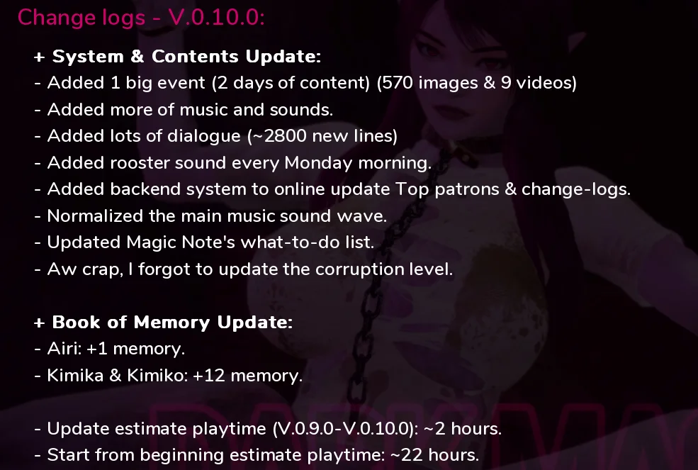 You grew up in an ordinary family with an ordinary life, except for the fact, you're the only man alive in the world! You've been living among beautiful girls in the Kingdom, yet, you still have no real actions with any girls. Then everything changed when you met The Red Witch. The one who will teach you about the magic power. The one who will pull you into the Dark Magic world. All girls in the Kingdom are awaiting you to meet them. Now it's your chance to corrupt them all! " This game is huge, hard, and really long, so please take your time playing and enjoy! "