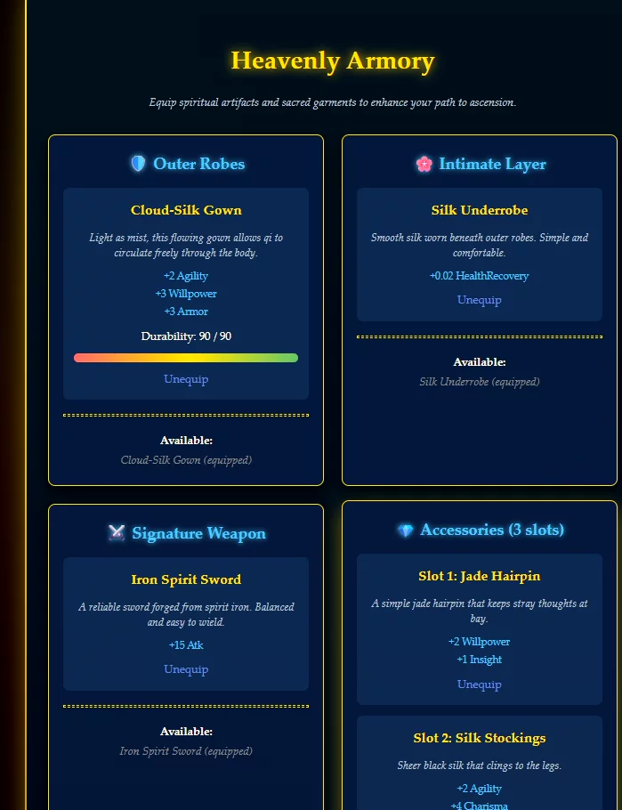 The game nails the whole cultivation vibe with actual consequences for your choices. You can slap down arrogant young masters, play politics, or pretend to be weak while secretly getting stronger. The stat building feels meaningful and the breakthrough system adds real tension to progression.