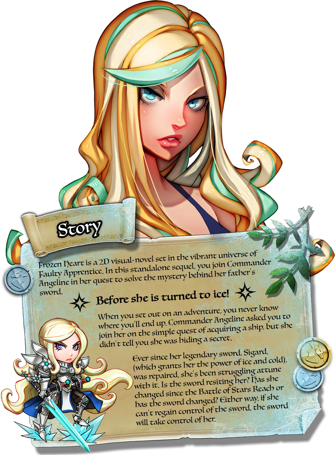 Commander Angeline’s struggle with her legendary ice sword creates an intriguing mystery that drives Frozen Heart forward. This 2D visual novel from AGL Studios serves as a standalone sequel set in the Faulty Apprentice universe, focusing on a commander whose powerful weapon might be turning against her. What starts as a simple ship acquisition quest quickly evolves into something far more personal and dangerous.