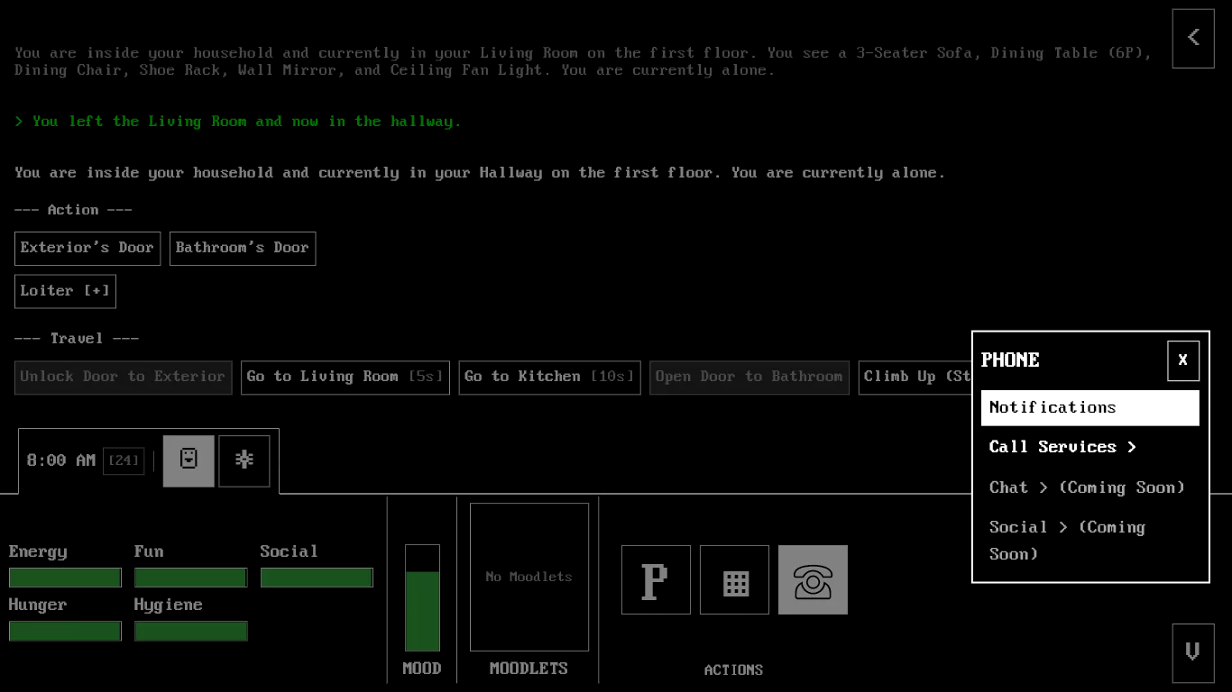 The whole thing runs on text commands and menus, so don’t expect fancy visuals. You manage stats like hunger, energy, and mood while building relationships with other characters. The adult scenes are pretty detailed if that’s what you’re after. It’s still early in development so there’s not a massive amount of content yet, but what’s there works fine.