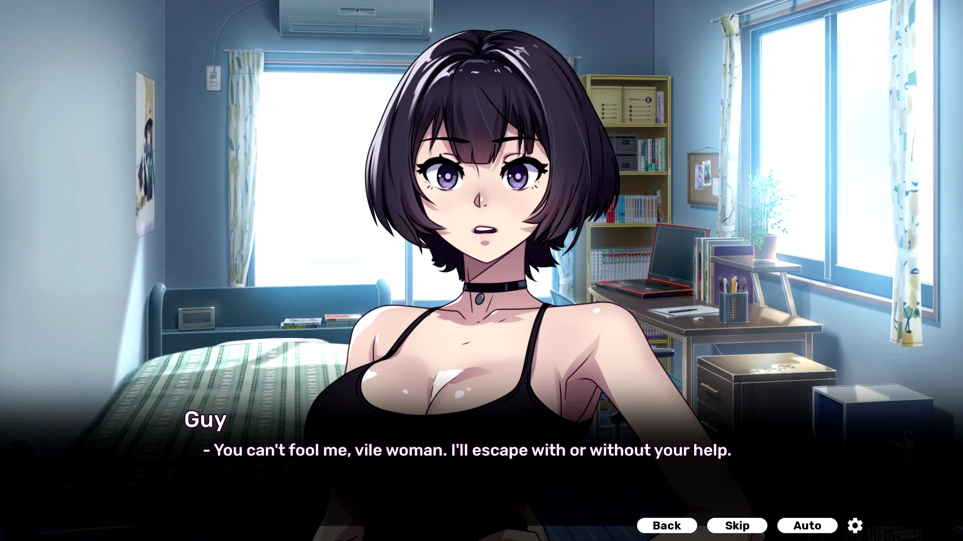 The game plays with your expectations about who’s really in control here. You might think you want to escape, but the title gives away the real question. Sometimes the scariest person in the room is also the most interesting, and this goth girl definitely fits that description.