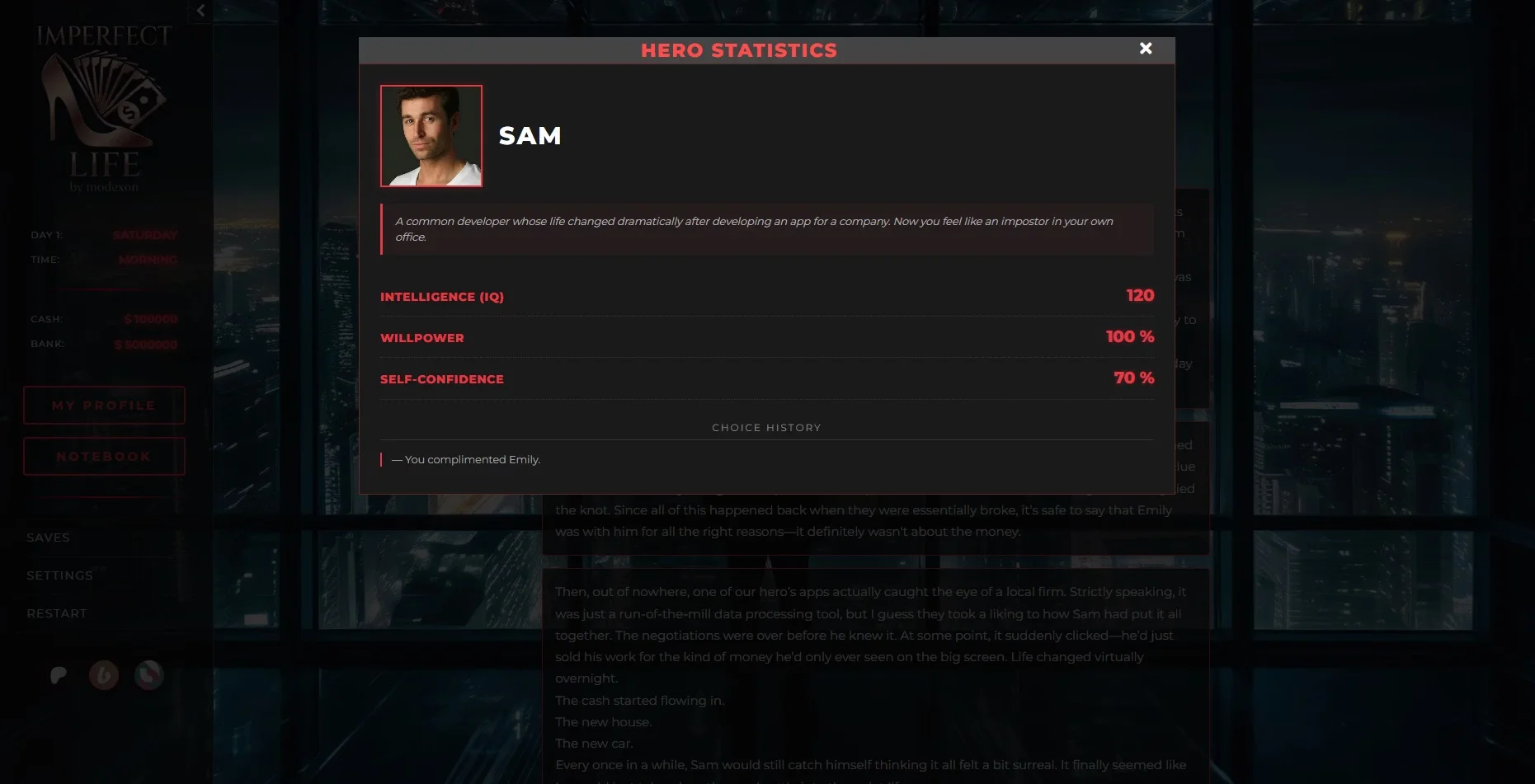 Imperfect Life delivers a gripping psychological thriller that examines what happens when coding genius meets corporate greed. You’re cast as a self-taught programmer who struck it rich by selling an app to a massive corporation, but the celebration doesn’t last long. The game’s premise immediately hooked me – there’s genuine tension in playing someone whose success story might be built on shaky foundations.