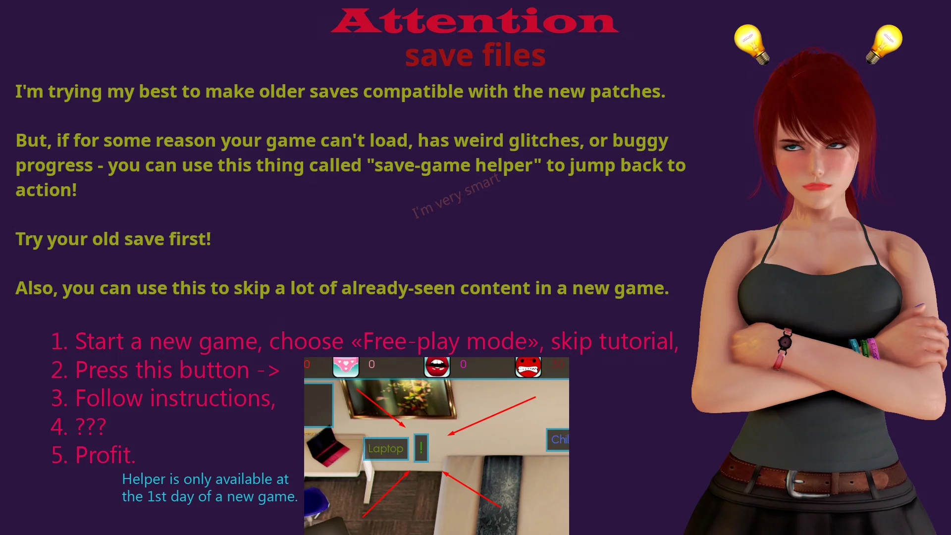 A Trainer-like, mostly animated game with its main focus on submission, humiliation, and female orgasm control/denial. Also includes outdated memes and a love story. Read the tags below! The main story follows the life of Sam. He's a simple guy within the mafia circle, who gained access to highly experimental tech. Most functions are unknown, and he, with some help from lively redhead Esther, will try to figure them out. How? Using it on his bitchy boss and girls around him!
