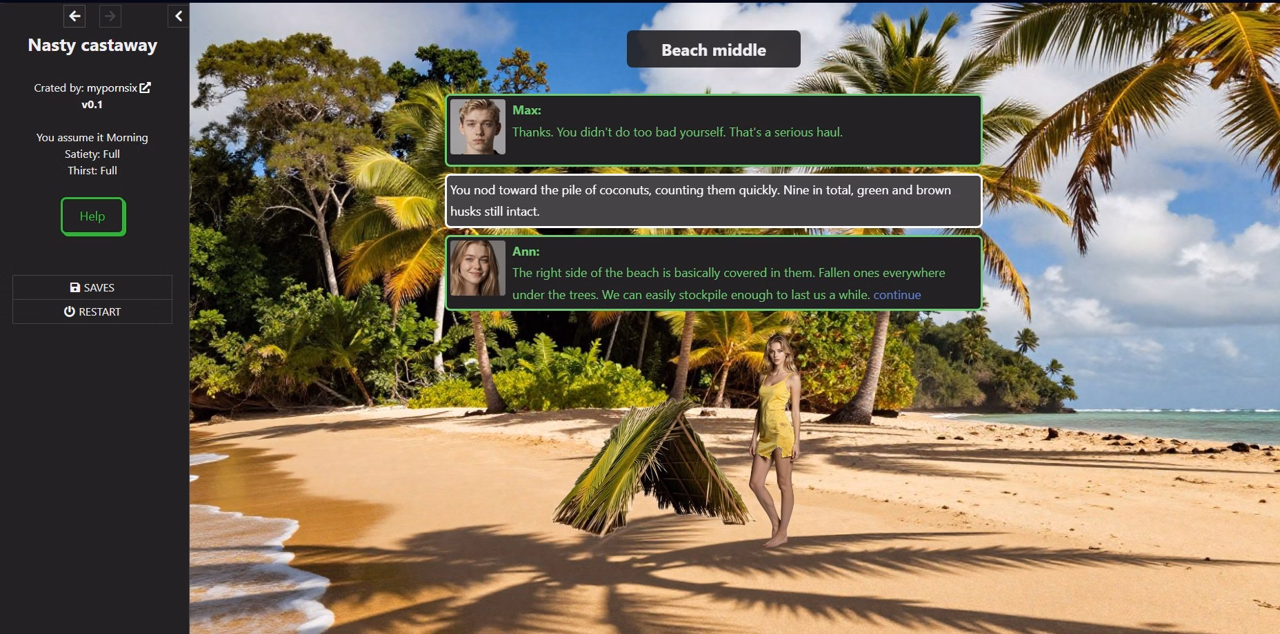 Being such an early version, don’t expect tons of content yet. Think of it more like a proof of concept that shows where the story might go. The island setting has potential for survival elements mixed with the relationship building, but right now it’s mostly about establishing the characters and their situation.
