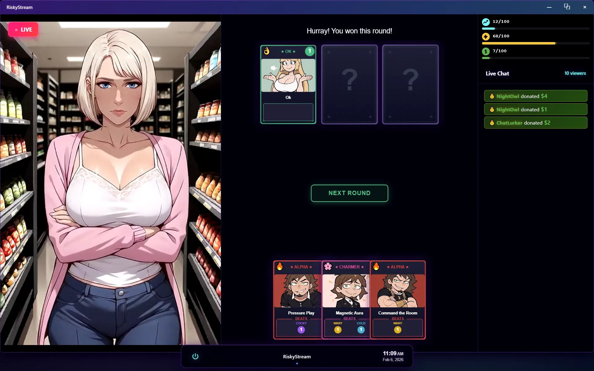 Not That Stream puts you in the shoes of a wannabe streamer trying to build an audience through risky public interactions. The whole thing revolves around a card-based system where every move could either boost your viewer count or completely tank your stream.