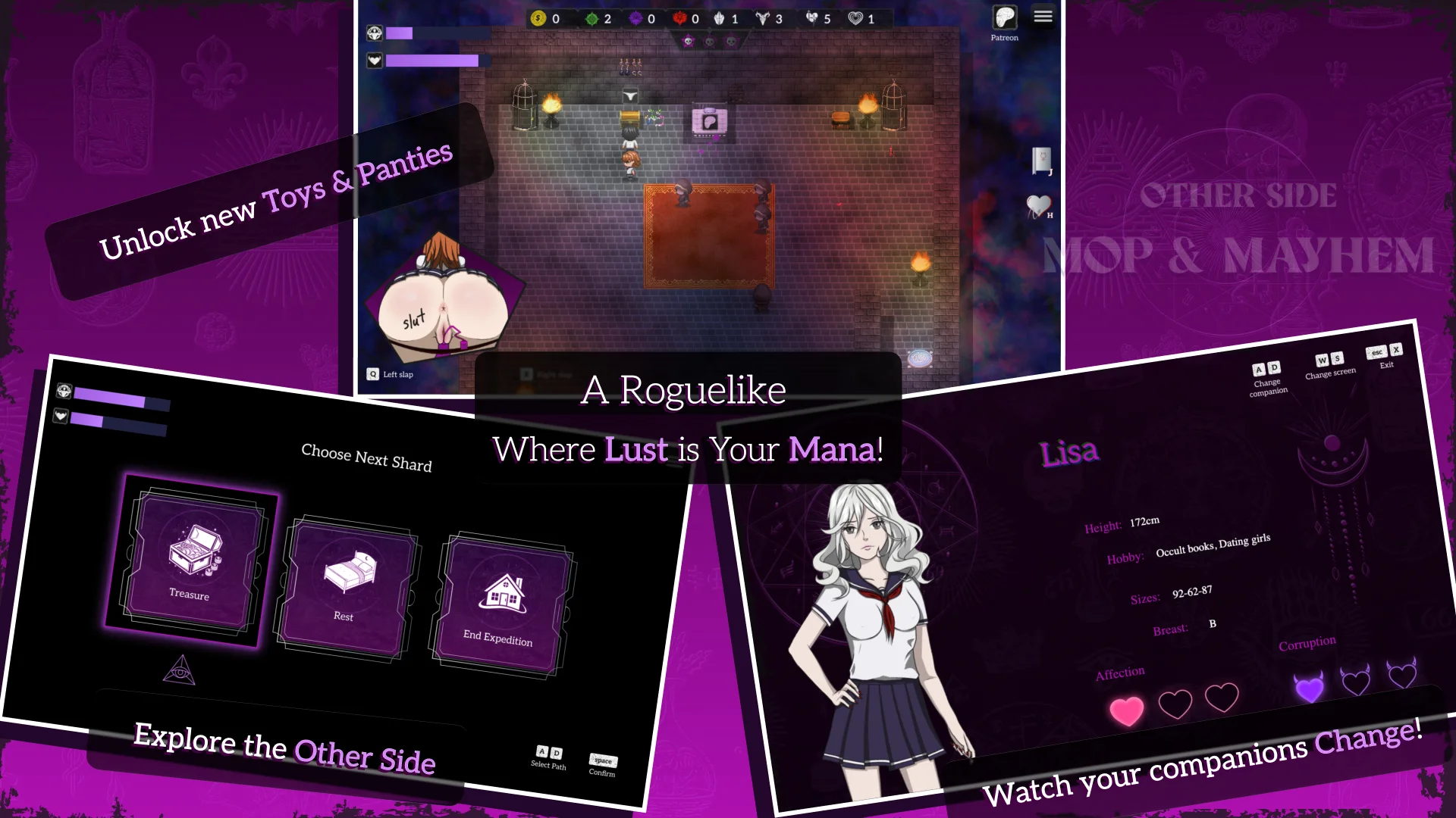 Become a Lewdmancer and turn lust into magical power! Her ass is your build, lewd toys are your buffs. In this daring roguelike, experiment with panties, toys, and signs to craft killer builds. Bond with your sexy companions: corrupt them or win their hearts. Can you save your lost friend or surrender to the temptations of Other Side?