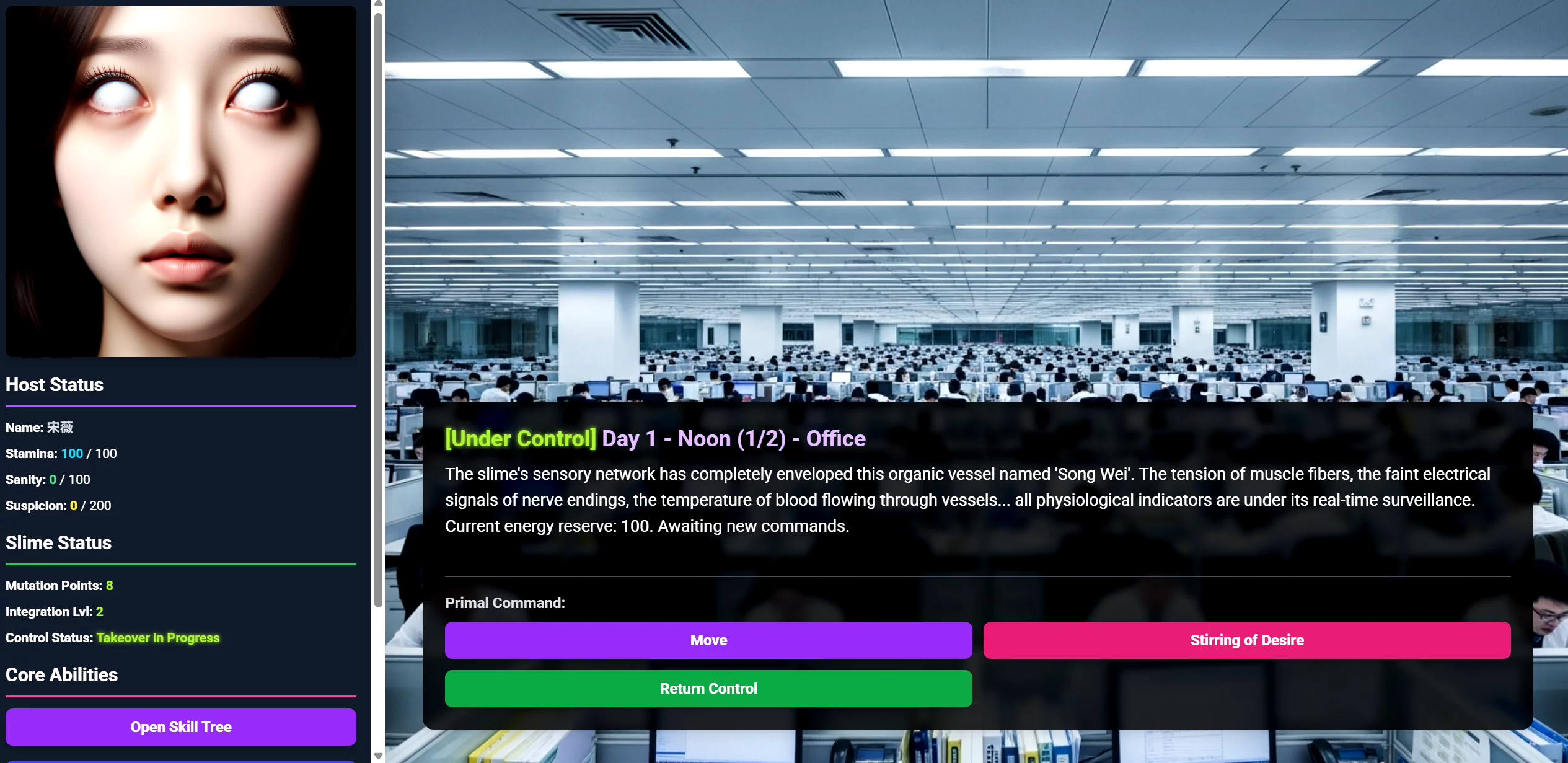 The gameplay revolves around making strategic choices to break down your host’s sanity while avoiding detection from the Foundation and other threats hunting you down. You can evolve your slime abilities through a skill tree system, which adds some nice progression elements. The branching story paths lead to different endings depending on how well you pull off the whole mind control thing.