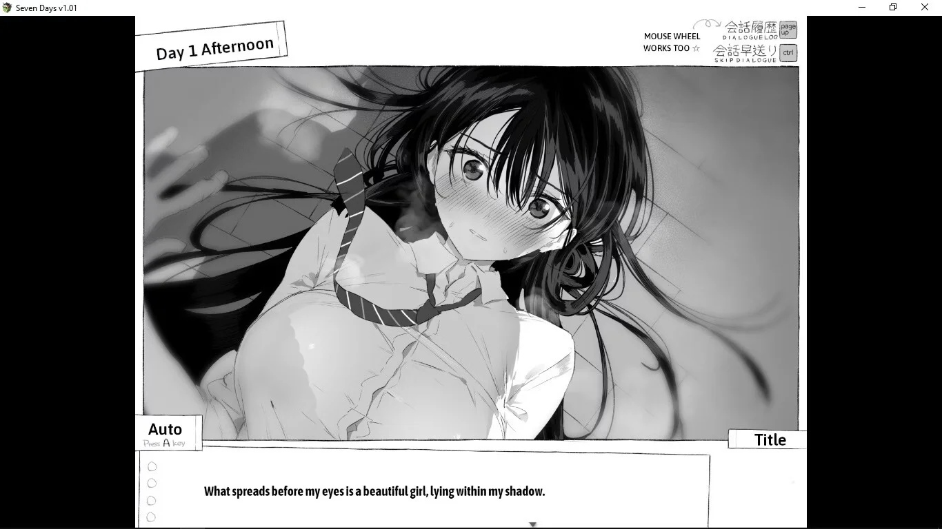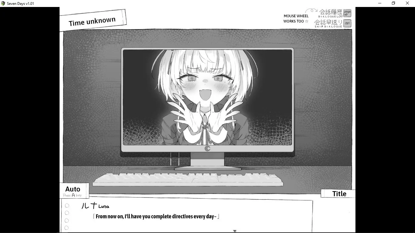 Concept A mystery visual novel presented in striking monochrome artwork. You awaken in confinement with a high‑school girl you’ve never met, and together you must endure seven days under the watch of a mischievous mastermind. Your willpower is tested against constant temptations and bizarre directives. Will you resist and uncover the truth, or surrender to forbidden desire? (One true ending, two bad endings.) Characters Lila: A proud genius and daughter of a pharmaceutical company president. The protagonist, a journalist, is coincidentally investigating her father. Luna: The mastermind, contacting you through a computer. Provocative and cunning, she clearly has hidden motives. Mysterious Girl: Appears in dreams, stirring doubt and desire. Features Visual Novel Format: Primarily text‑driven with limited choices that branch the story. Monochrome Art Style: Distinctive black‑and‑white illustrations create a unique atmosphere. Multiple Endings: One true ending and two bad endings depending on your decisions. Content: Over 400 CGs, 15 major events, hand‑drawn animations, and a script exceeding 110,000 words. System: Text skip, auto‑advance, backlog, and replay mode included.