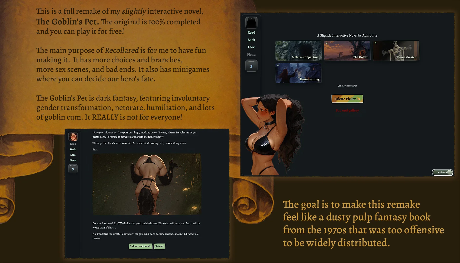 Adult gaming enthusiasts looking for narrative-driven experiences will find The Goblin’s Pet – Recollared offers a bold transformation story that doesn’t hold back. The game follows Aldric, once a celebrated hero, who finds himself magically collared and transformed into a different form entirely. This sets up a dark fantasy scenario where players navigate a world of servitude and complex power dynamics.