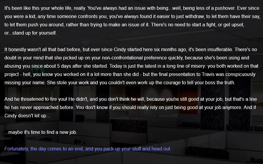 What works here is how the consequences feel genuine. Stand up for yourself too aggressively and people push back. Stay too passive and you end up stressed and resentful. The game finds that middle ground where assertiveness means being direct but not hostile. The writing captures those awkward moments when you finally decide to set boundaries and people react like you just grew a second head.